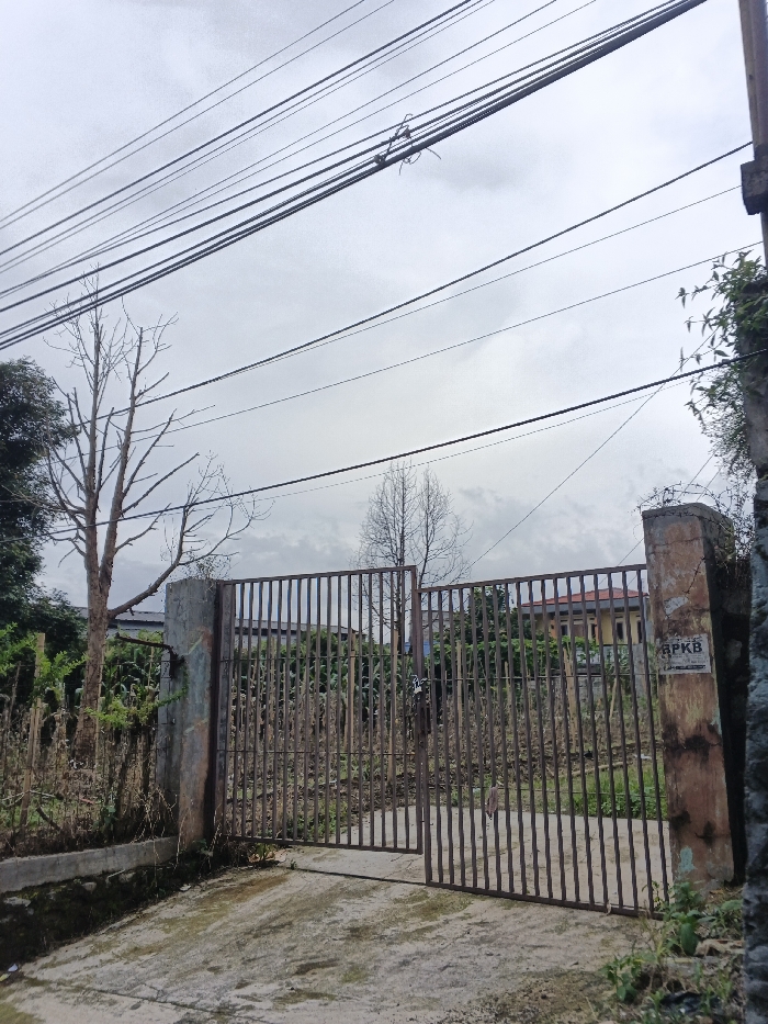 The scene depicts an outdoor view in Bhimad, Nepal, focusing on a partially open, two-panel, dark metal bar gate. The gate, secured by a visible padlock on the left panel, is flanked by weathered concrete pillars. The right pillar displays a white sign with black text reading "BPKB" and has barbed wire on its upper surface. Beyond the gate lies an unkempt or cultivated plot featuring rows of dried or dormant crops and several bare trees. In the background, residential structures are visible, including a yellow house with a red-tiled roof on the right, and a building with a dark roof on the left. The immediate foreground consists of a concrete path with patches of moss and weeds. Overhead, numerous parallel power lines are strung across an overcast, light grey sky. A tangled object, possibly debris, is caught on one of the upper power lines. No individuals are present in the image.