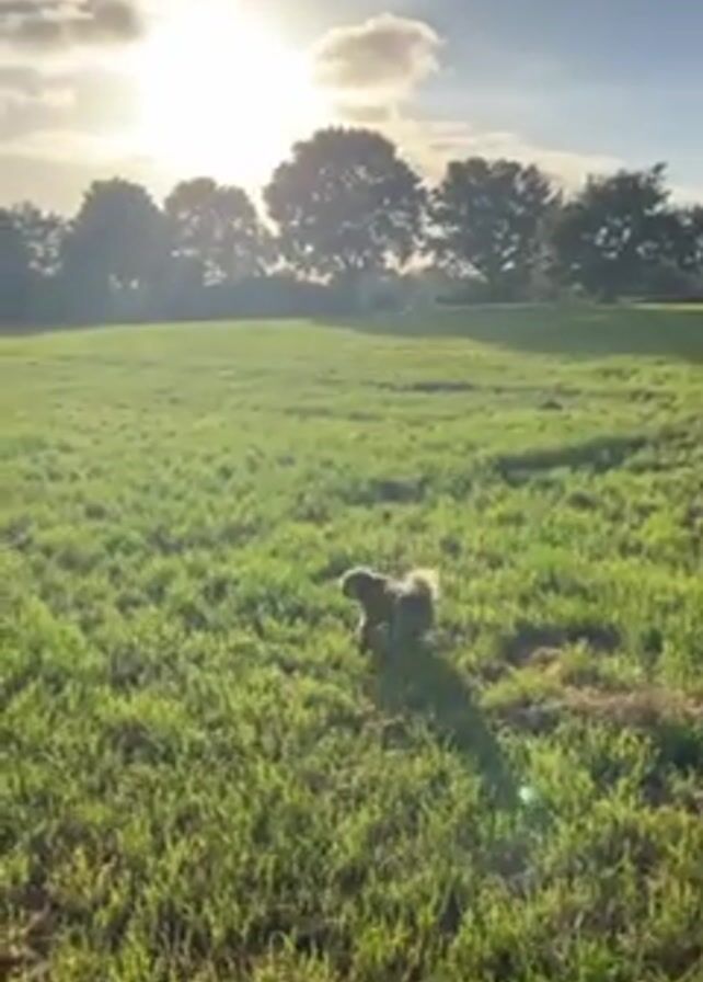 A small, shaggy, dark-colored dog is running in a grassy field under a partly cloudy, sunny sky. The sun is high in the sky and partially obscured by clouds. There are trees in the background along the horizon. The grass is green and slightly overgrown, creating a meadow-like environment. The dog is moving away from the camera, and someone says the German word "Los".