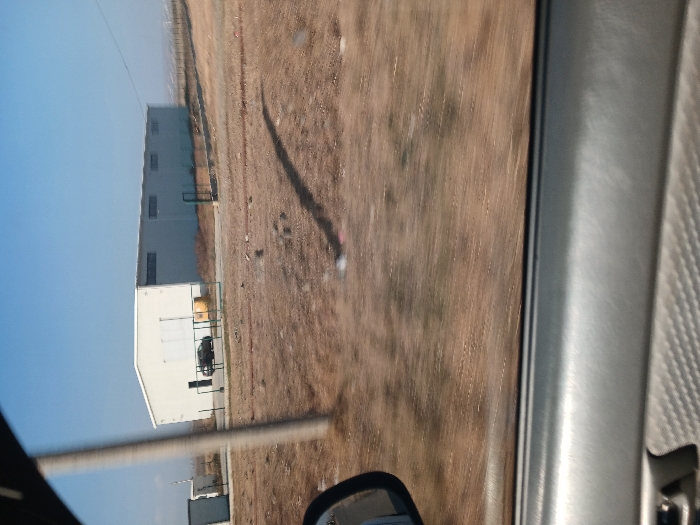 The image depicts an exterior view captured from the interior of a moving vehicle, evidenced by the car door panel and rearview mirror visible in the lower left and bottom sections, and motion blur in the foreground. The scene presents an industrial or undeveloped area in Rustavi, Georgia, under a clear, bright blue sky. In the mid-ground, a large, light-colored, rectangular industrial building with a flat roof and several small, dark windows or vents is prominent. A dark-colored sedan is parked in front of the building, behind a low metal fence. Near the parked sedan, a yellow cylindrical object, possibly a drum or container, is visible. To the left of the main building, behind a separate fence line, several smaller utility structures or sheds are present. The foreground and mid-ground consist of dry, barren, brown earth with minimal vegetation. A distinct, elongated dark shadow stretches diagonally across the ground from the left mid-ground towards the right. A tall, light-colored utility pole stands vertically in the left mid-ground, partially blurred. The far background shows a hazy skyline with faint outlines of distant structures or hills, suggesting the broader landscape of the city's outskirts. No individuals are visible.