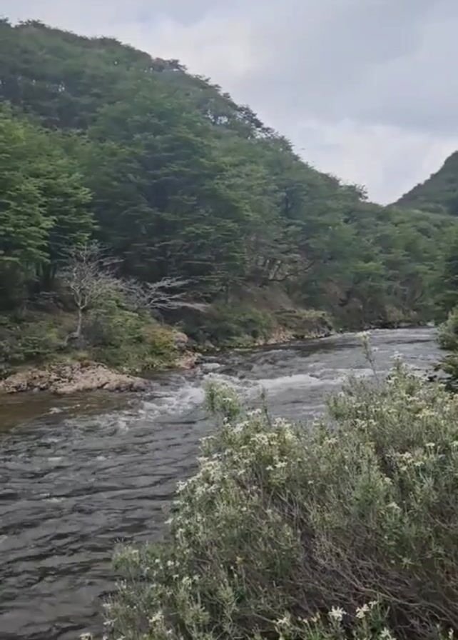 river flowing through a valley. The river is surrounded by trees and bushes. The sky is cloudy. The river water is dark and moving fast.
