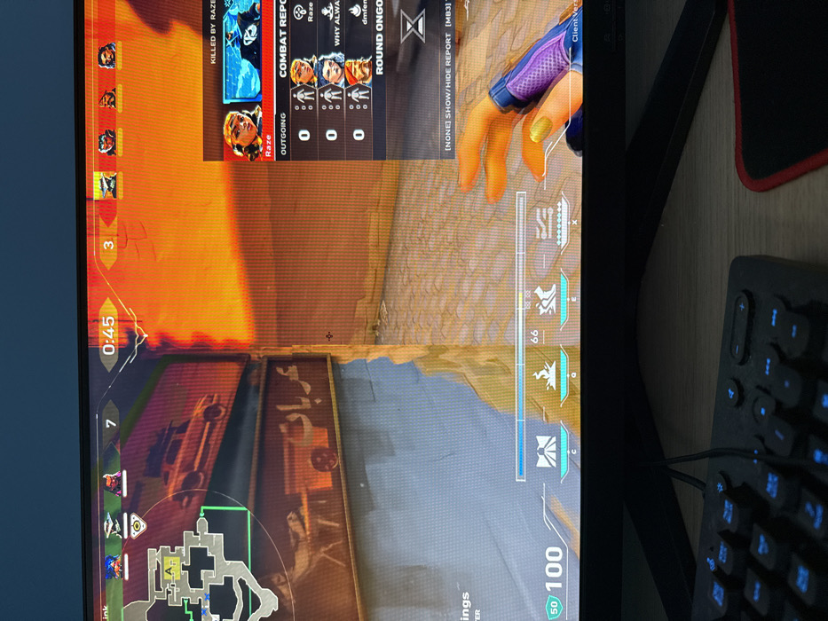 The image displays a computer monitor positioned on a light-colored wooden desk, located in the city of Unknown, Unknown. The monitor screen shows a first-person perspective of a video game, identified as Valorant by its user interface elements. The in-game scene depicts an urban environment, possibly a Middle Eastern-themed map, with light brown and orange structures. A wall on the left features Arabic script, specifically the word "عربات" (carriages or carts), and a mural of a light-colored vehicle, possibly a jeep or SUV. The ground is textured like cobblestones or paved stones. The right side of the screen is dominated by an intense orange glow, possibly from an in-game ability or environmental effect. The game's user interface is visible: * A mini-map is in the upper-left, showing player positions and an objective labeled "A". * A timer "0:45" and round scores "7" (friendly team) vs "3" (enemy team) are displayed at the top center. * A "KILLED BY RAZE" notification is visible in the upper-right. * A "COMBAT REPORT" overlay on the right shows "OUTGOING 0" for three player avatars, including "Raze" and another with the partial name "WHY ALWAY_". * At the bottom-left, player health "100" and armor "50" are displayed. * Four ability icons (C, Q, E, X) are shown at the bottom-center, with one (Q) indicating a cooldown or charge of "66". * The character's in-game hand is visible in the bottom-right, featuring yellow painted fingernails and a purple/blue sleeve or glove. Below the monitor, a dark-colored keyboard with blue backlit keys is present on the desk, connected by a black cable. To the right of the keyboard, a black mousepad with a red border is visible.