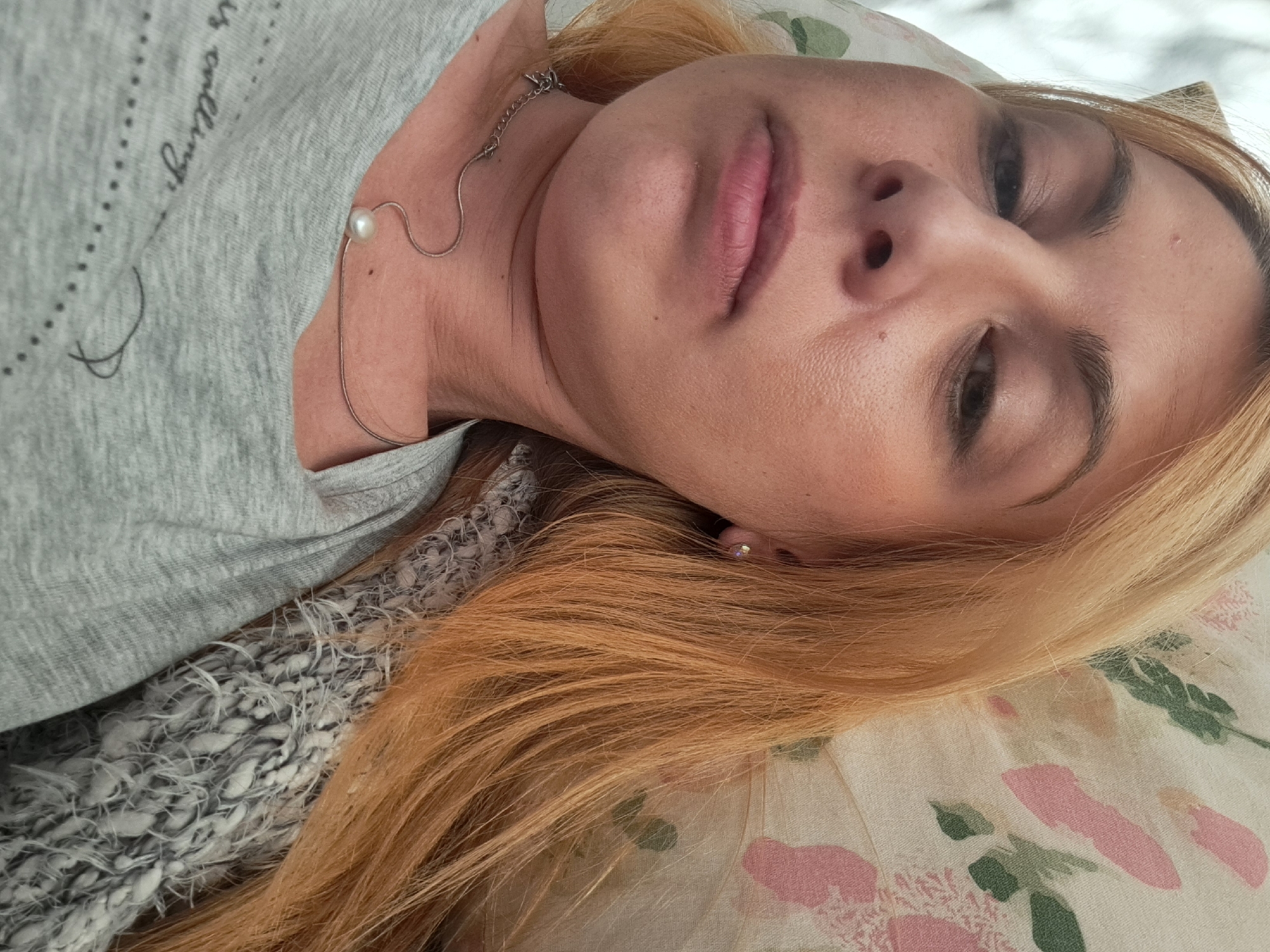 A woman is lying down, possibly on a bed or soft surface, in an indoor setting. She has fair skin and light brown to blonde hair. She is wearing a light grey t-shirt with some text. A necklace with a pearl embellishment is visible around her neck. The background features a floral pattern on what appears to be a pillow or bedding. The location is not identifiable as Sevlievo, Bulgaria based on the visual information provided. There is no information about actions, interactions, and environment, but the scene suggests a relaxed or restful setting.