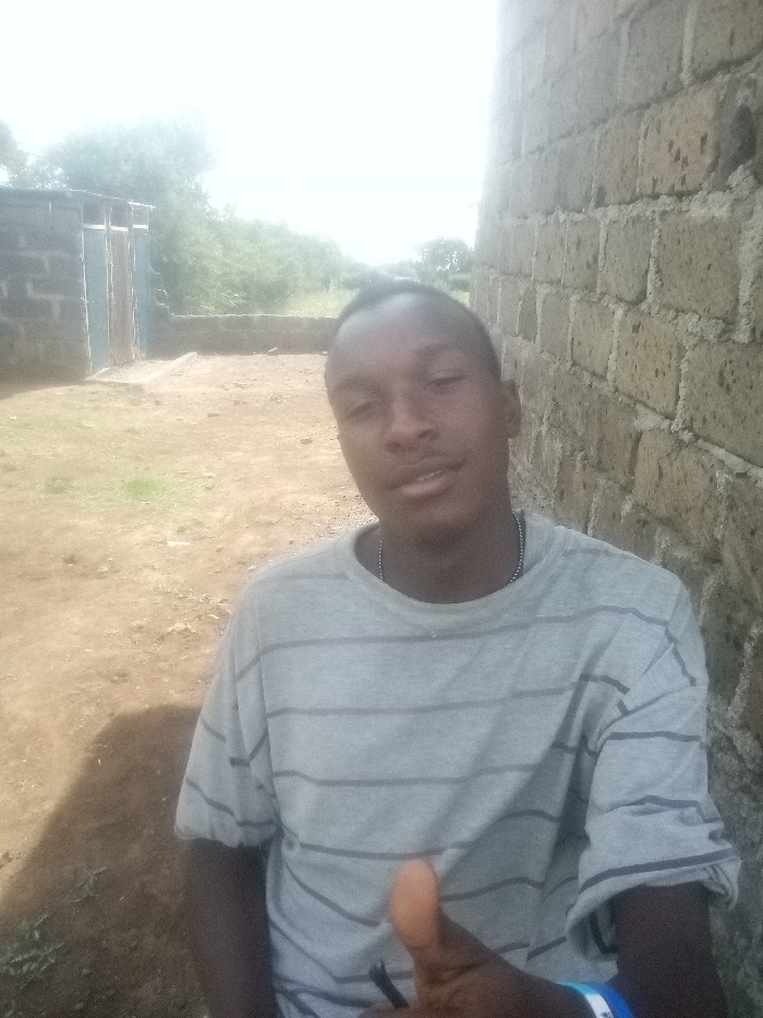 A young man with short hair wears a gray striped t-shirt, a silver necklace, and a blue wristband. He gives a thumbs-up, holding a small black object in his hand. Behind him is a gray brick wall to the right and a dusty yard with a brick structure on the left. Lush green vegetation can be seen in the background under a bright, overcast sky.