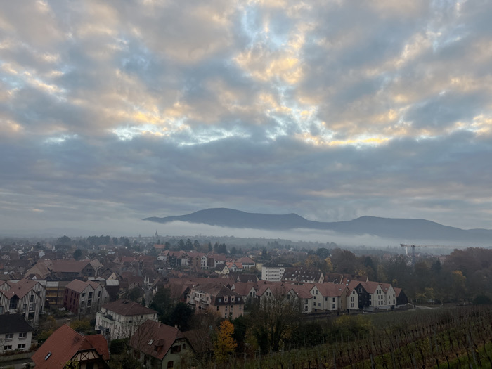 An elevated, wide-angle photograph depicts a panoramic view of the city of Obernai, France, under an overcast sky with atmospheric haze. In the foreground, spanning the lower right, are rows of dormant grapevines characteristic of a vineyard. The midground encompasses the urban landscape of Obernai, featuring a dense arrangement of buildings, predominantly residential, characterized by numerous red and orange tiled roofs. Various architectural styles are present, including structures with light-colored facades and darker elements, some displaying half-timbering. A prominent church spire is visible rising above the rooftops in the central-left area, partially obscured by a pervasive layer of fog or haze that blankets parts of the city. To the far right, a large white building complex and a construction crane are discernible. The background features a range of mountains, partially obscured by a thick layer of low-lying fog and clouds, forming dark silhouettes against the sky. The upper portion of the image is dominated by an overcast sky with stratified clouds, exhibiting patches of golden-yellow and pale blue light, indicating diffuse illumination. No individuals or direct actions are depicted within the scene.
