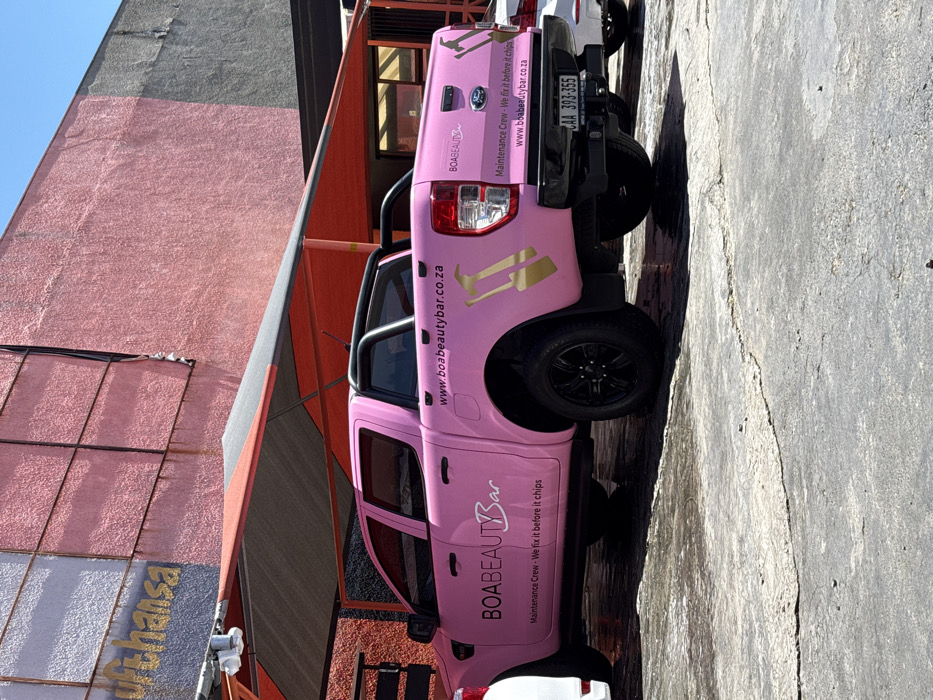 The image depicts an outdoor scene in Cape Town, South Africa, evidenced by the "CAA" prefix on the vehicle's license plate. A pink Ford Ranger double cab pickup truck is prominently parked on a concrete surface, partially shaded by a red and black fabric canopy. The truck features black wheels, a black roll bar, and black trim. Custom decals on the vehicle include "BOABEAUTYBar" in black lettering on the side, a slogan stating "Maintenance Crew - We fix it before it chips," and the website "www.boabeautybar.co.za." A large golden decal resembling a nail polish bottle and brush is visible on the rear side panel, with another smaller instance on the tailgate. The license plate reads "CAA 393-355." In the background, a building with a textured facade is visible, painted in sections of off-white/light grey, pink, and dark grey/black. Faint, partially visible gold lettering on the light grey section spells "ufthansa," suggesting a former "Lufthansa" sign. Windows are discernible on the building's right side. A small portion of a white vehicle is visible to the left of the pink truck, and another white vehicle is partially visible behind it on the right. No individuals are present in the frame. The scene is brightly lit, indicative of daylight conditions.