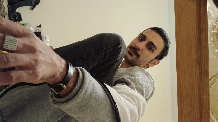 A man is pictured from a low angle, his arm extended towards the camera showcasing a square ring and a black leather wristwatch. He's wearing grey jeans and a layered grey and white top. The man has dark hair, a mustache, and is glancing down at the camera. In the background, there's a cream-colored wall, a wooden frame, and a glimpse of items atop a surface, including a black bag.