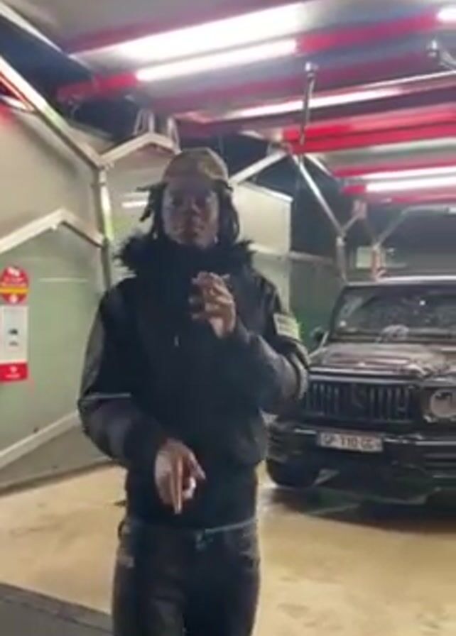 . The video appears to be a music video of an individual dancing and singing in front of a car wash with a black Mercedes-Benz G-Wagon. The main individual is wearing a dark puffy coat, grey jeans and a cap with a colorful pattern. Behind him in the background, another person is standing beside the G-Wagon. The person in the foreground dances and then points upwards towards the red car wash sign. The video then transitions to show the G-Wagon covered in soap. The scene suggests they are waiting for it to be cleaned. In the background, someone uses a brush to clean the car.