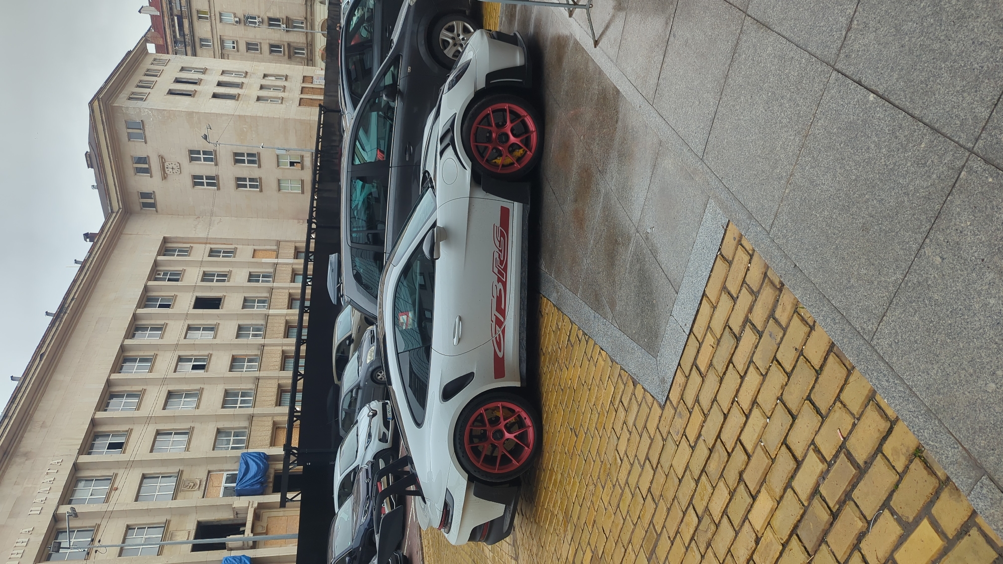 A white Porsche 911 GT3 RS is parked on a wet paved surface in Sofia, Bulgaria