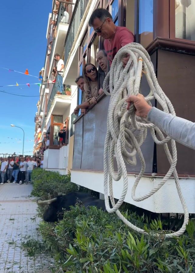 Filmed from the ground, the video captures people standing on balconies of a tall building overlooking a street event. One individual on a balcony throws a large white rope down, while another films. Below, a crowd gathers on the sidewalk. Someone mentions "comprobando," meaning checking or verifying, before stating that "las labores," meaning tasks or works, will proceed. The buildings, blue sky, and a few decorations suggest a lively public event.