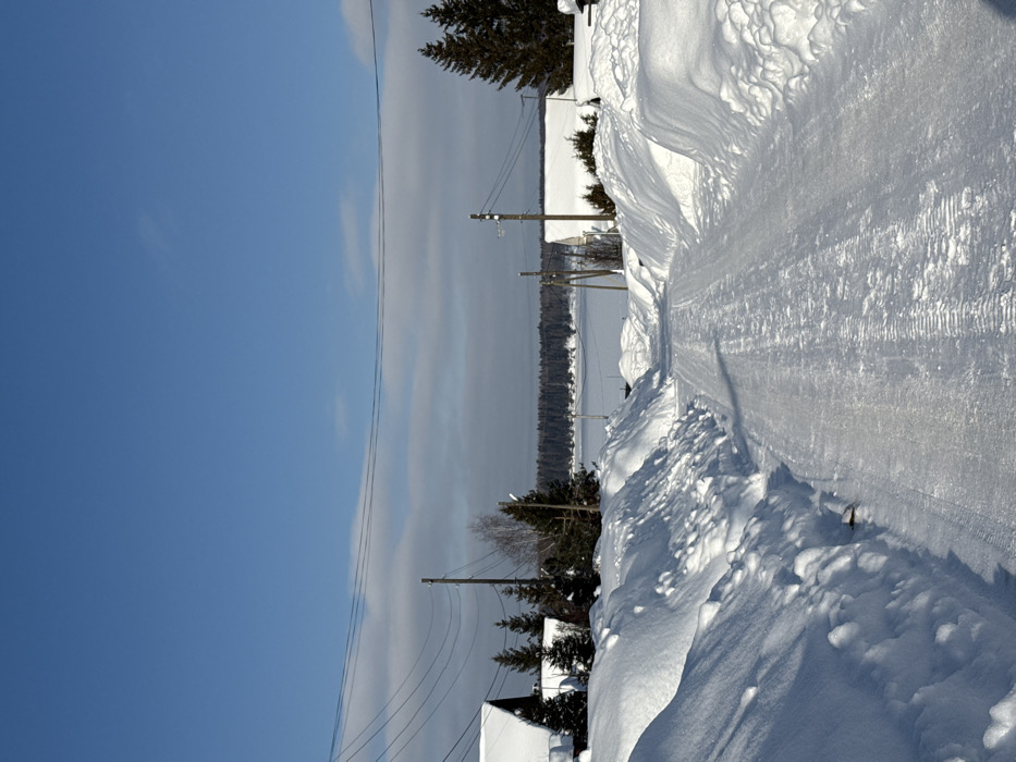 This image depicts a snow-covered winter street scene in Zhebrei, Russia. A cleared road, exhibiting tire tracks on packed snow or ice, recedes into the distance, flanked by substantial snowdrifts on both sides. On the left, a dwelling with a snow-laden dark roof is partially visible, accompanied by evergreen trees and a bare deciduous tree. Multiple utility poles carrying power lines traverse the upper mid-ground. On the right, another structure with a snow-covered roof is partially obscured by snow banks and evergreen trees. In the background, a frozen, snow-covered body of water extends towards a dense treeline of evergreen forest. The sky above is largely clear blue, with a band of thin white clouds positioned lower near the horizon. No individuals or animals are present. The scene is illuminated by bright sunlight, casting visible shadows.