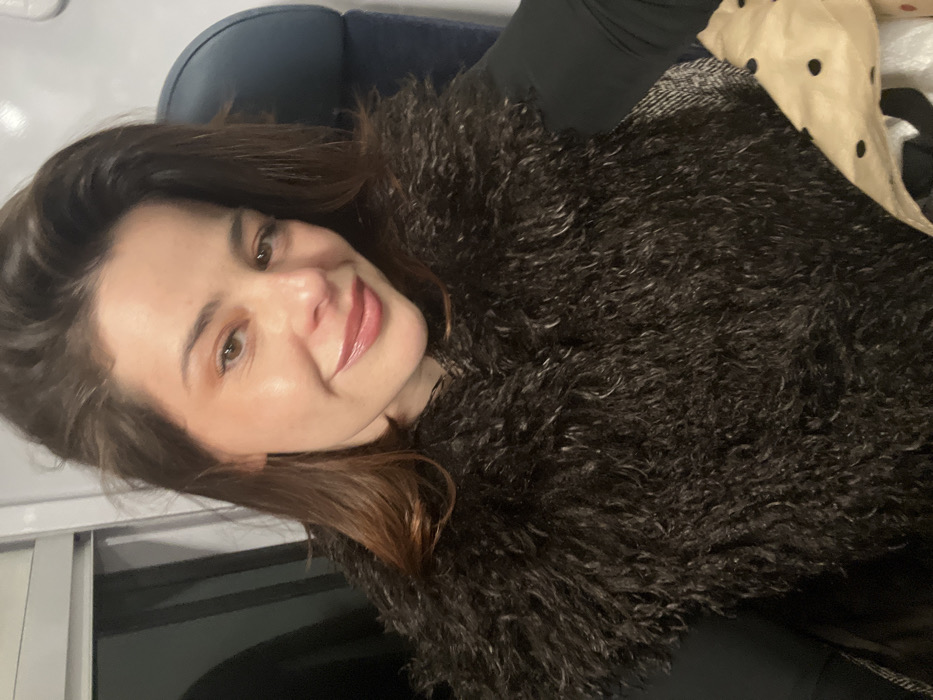 A woman smiles at the camera, with a dark curly garment covering her shoulders. She has dark brown hair and fair skin. A blue seat is visible behind her. A window frame with bars can be seen in the lower left corner. A patterned beige and black bag rests to her right. She wears makeup including lip gloss and eyeshadow.