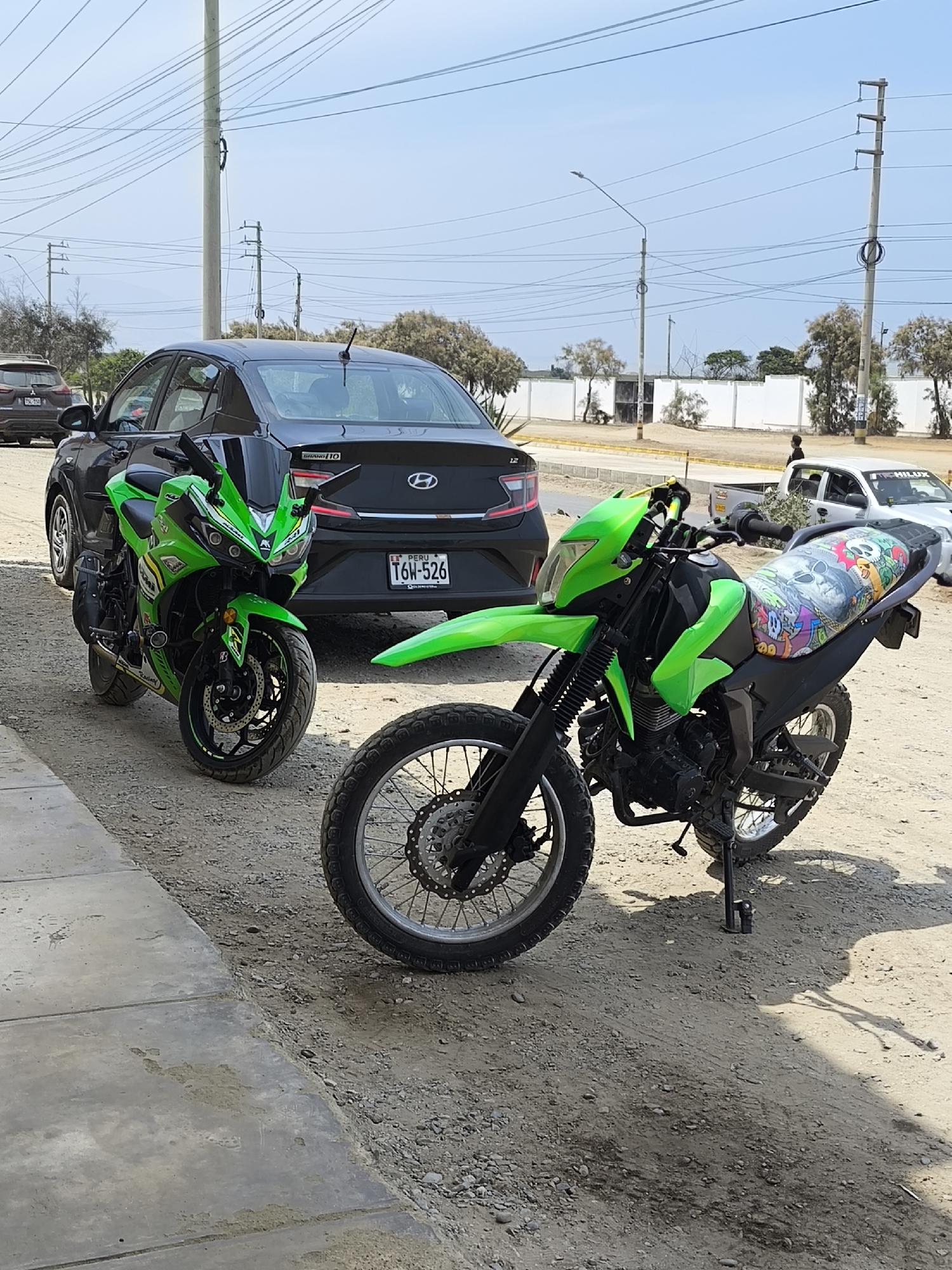 The image depicts two green motorcycles parked next to a black Hyundai Grand i10 sedan with Peruvian license plate T6W-526 in Huanchaco, Peru. A gray SUV is visible behind the sedan. A white Toyota Hilux pickup truck and a person are visible in the background. Power lines are visible above. The ground is dirt with some gravel. A concrete sidewalk borders the dirt area on the left.