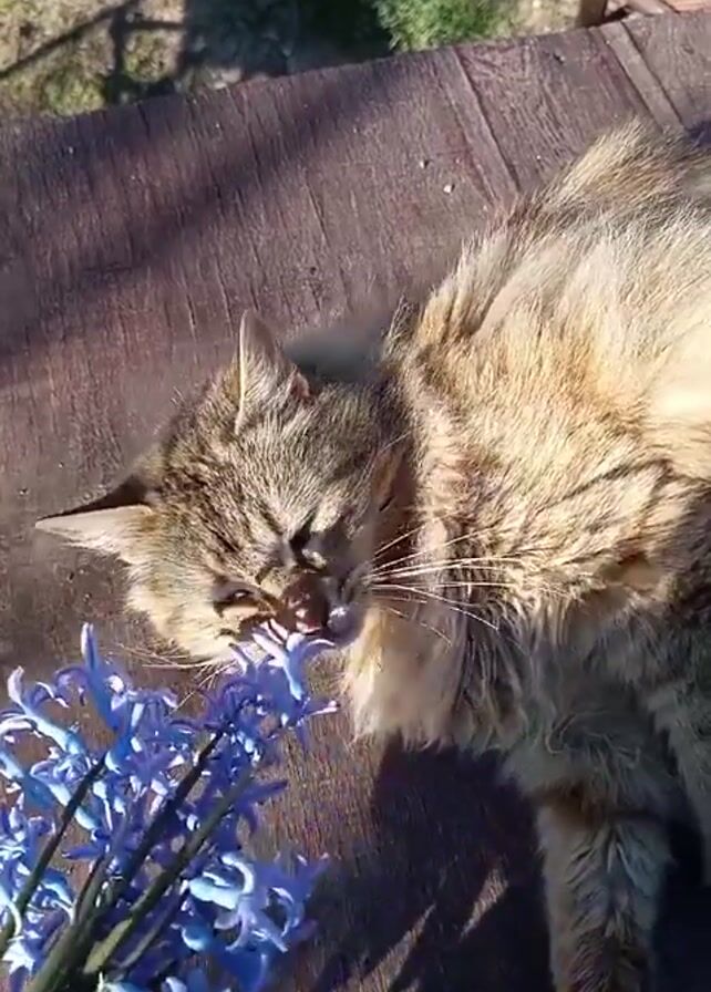 A tan-colored cat lies on a weathered wooden surface next to a bunch of blue hyacinths. A hand holding the hyacinths is visible. The cat sniffs the flowers. Sunlight illuminates the scene. The background shows grass and the shadow of a person.