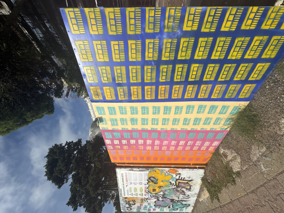 This image depicts a temporary construction barrier in Rafailovići, Montenegro, observed under clear skies. The barrier consists of multiple vertical panels forming a perimeter for a construction site. From left to right, the barrier features: 1. A white panel covered with multi-colored graffiti, including abstract shapes and stylized letters in yellow, purple, and green. A white rectangular sign, partially obscured by graffiti, is affixed to this panel. The sign displays text, including "BEZBJEDNOST NA GRADILIŠTU" (Safety on the construction site), accompanied by various warning symbols. 2. An orange panel featuring a repeating pattern of stenciled light blue or teal rectangles, representing windows or balconies. 3. A pink panel with an identical repeating pattern of stenciled light blue or teal rectangles. 4. A light yellow or cream-colored panel with the same repeating pattern of stenciled light blue or teal rectangles. 5. A blue panel with a repeating pattern of stenciled yellow structures, resembling windows with balconies. The base of the barrier rests on a narrow strip of dirt and sparse green grass, which borders a grey paved sidewalk or curb in the immediate foreground. In the background, above and behind the barrier, large dark green trees (likely conifers) are visible against a blue sky with scattered white clouds. Beyond the trees, scaffolding is discernible on an partially constructed building, indicating an active development site. No individuals are present in the scene.