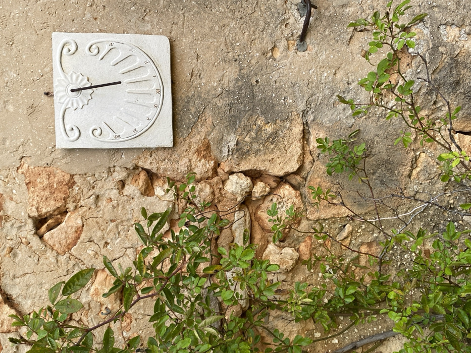 This vertical close-up image displays a section of an aged wall in Apt, France. The wall's left and lower-central portions are constructed from rough, irregular light brown and beige stones set in mortar. The upper right and lower right sections consist of a lighter, beige-grey plastered or rendered surface, which exhibits dark staining and minor cracks. A vibrant green climbing plant, characterized by numerous small leaves and thin, dark stems, covers the left side and extends across the lower-central part of the stone wall. Mounted on the upper right rendered section is a square, pale grey vertical sundial. The sundial features a central dark gnomon projecting downwards from a carved sunburst design at its top. The gnomon casts a shadow across the sundial's semicircular face, which is embossed with vertical lines and Roman numerals indicating hours, appearing to be just past XI. A dark, rusted metal bar or hook is partially embedded in the lower right portion of the rendered wall. No people or animals are present.
