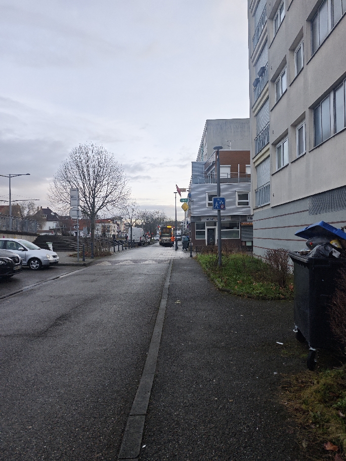 A street view with a sidewalk and road. A garbage truck moves down the street in the distance. Cars are parked on the left side of the street. A pedestrian crossing sign stands near a building with a striped facade. An apartment building dominates the right side. A bare tree stands near a staircase. The sky is overcast. A trash can is on the right side of the sidewalk.