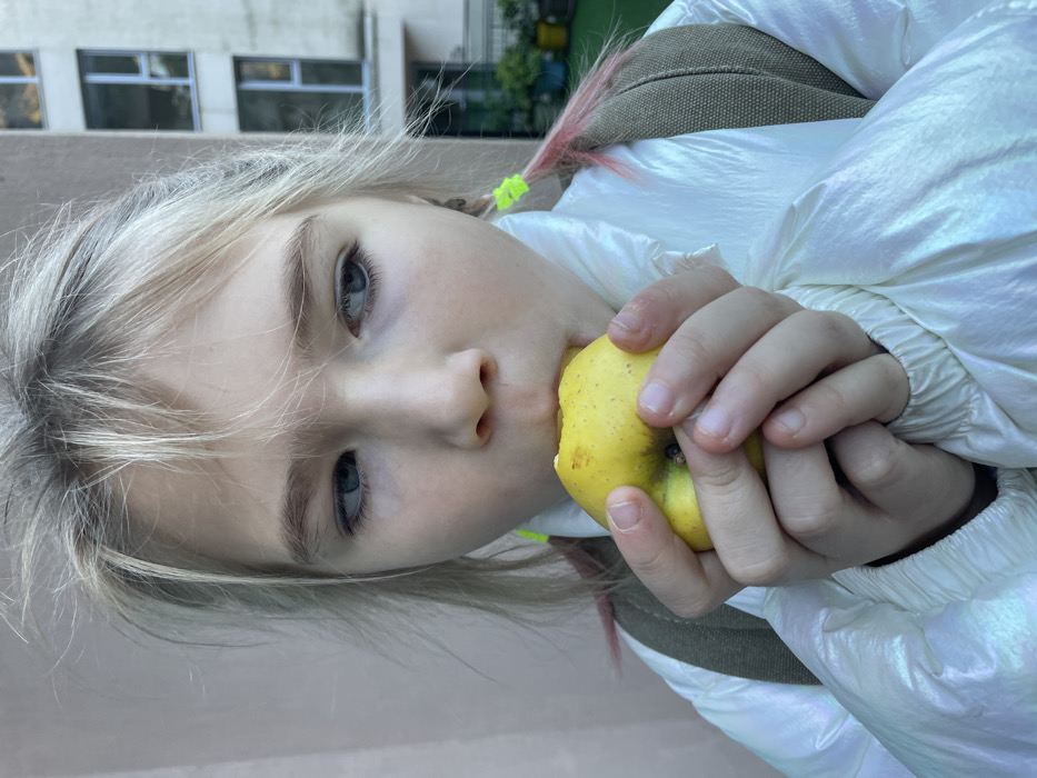A young girl with blonde hair and blue eyes is eating a yellow apple. She is wearing a white, iridescent jacket and has two small pigtails held together with neon green hair ties. There are hints of pink streaks in her hair. She is holding the apple with both hands, taking a bite. The background includes a building with windows and some greenery. The photo is taken at an unusual angle, tilting the subject to the side.