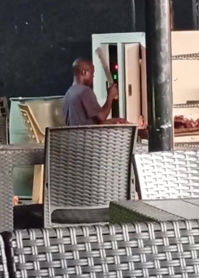 Here's a concise description of the video: The video shows a man standing in what appears to be an outdoor restaurant or patio setting
