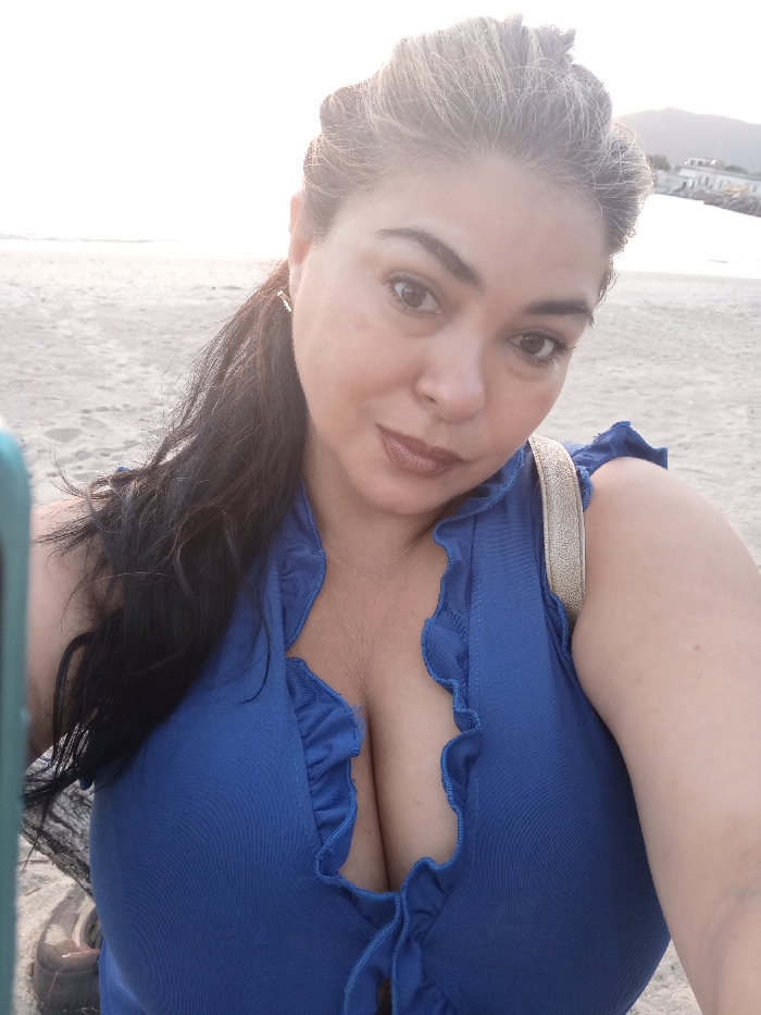 The image displays a waist-up portrait of a single female individual positioned in the foreground at a beach location in Juan Griego, Venezuela. The woman, appearing to be middle-aged, has long, dark hair, styled with some volume on top, and brown eyes. She is wearing a royal blue sleeveless top featuring a deep V-neckline with ruffled detailing. A small, light-colored earring is visible in her right ear, and a gold-colored strap, indicative of a bag or backpack, rests on her right shoulder. Her lips are adorned with dark reddish-brown lipstick. She is looking directly towards the camera, suggesting the image is a self-portrait. The background consists of a sandy beach under bright, diffused daylight. A body of water is visible beyond the sand. In the distant right, a cluster of white buildings can be observed along the coastline, backed by a mountainous landmass. A partial view of a teal-colored object, consistent with a smartphone, is present in the lower-left corner of the frame, partially obscuring a dark, indeterminate object on the sand.