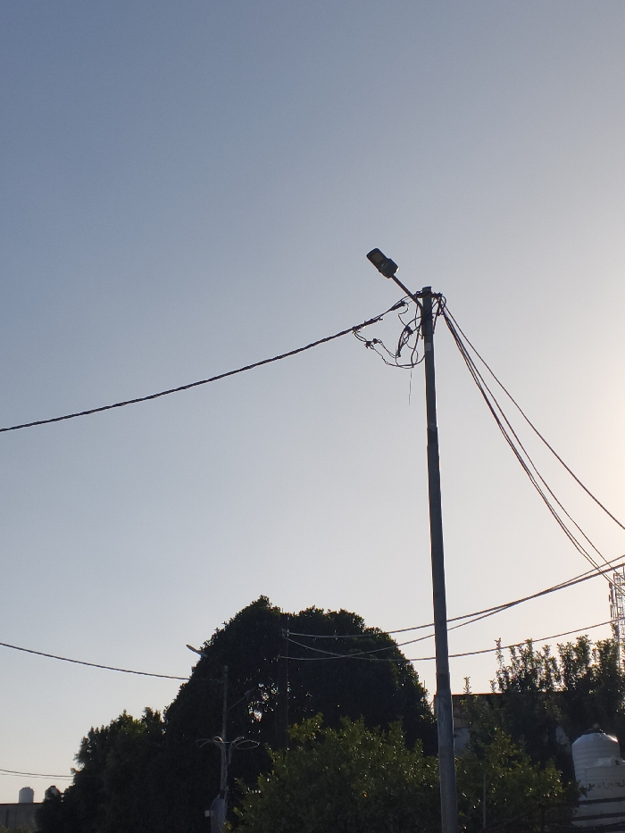 The image captures an outdoor daytime scene in Sheikh Hussein Village, Jordan, under a clear, light blue sky, with visible sunlight originating from the upper right. A tall, grey utility pole stands centrally on the right side, extending from the bottom of the frame. Attached near the top of this pole is a dark-colored street light fixture. Numerous dark electrical wires are connected to the pole, forming a dense tangle below the street light and stretching horizontally across the upper mid-ground, as well as diagonally downwards to the right. Dark green, dense tree foliage occupies the lower-left and central areas of the frame, partially obscuring a smaller, street light-like fixture on a separate pole beneath the canopy. In the lower right corner, a white water tank is partially visible, and in the far upper right background, a faint metal lattice structure, likely a telecommunications tower, is present. No individuals or discernible actions are depicted.