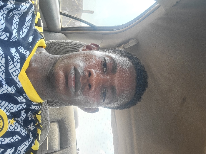 An image taken in the city of Nwofia, Nigeria, shows a single male individual seated in the front passenger compartment of a vehicle. The subject, an adult male with dark skin and short, dark hair, looks directly into the camera with a neutral expression. His face exhibits a slight sheen, possibly moisture. He wears a dark blue or black short-sleeved shirt with a yellow collar and yellow accents. The shirt is patterned with repeating white text, prominently displaying "INTER," and features a circular yellow emblem on the lower right side. A thin, gold-colored chain is visible around his neck. The vehicle's interior features a light brown or beige headliner and similarly colored, somewhat worn upholstery on the seats, including a striped headrest behind the subject. The rear passenger seats are visible, appearing light-colored and showing signs of wear. Through the left-side window, a bright, hazy outdoor environment is discernible, along with a partial view of a rudimentary outdoor structure, possibly a fence or wall, made of rough materials. The overall lighting suggests daylight conditions. No other individuals or significant objects are present within the frame.