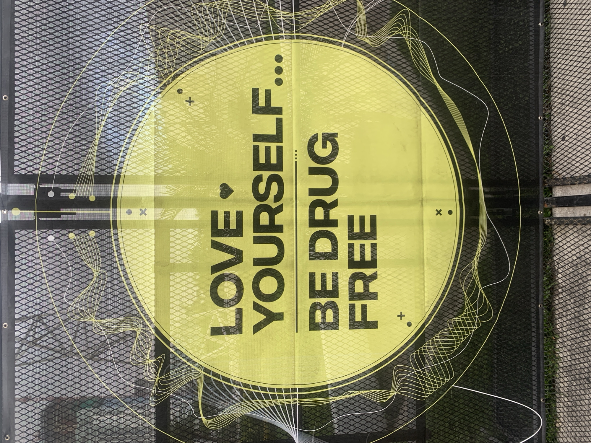 A sign on a metal fence in Miami, Florida features a large yellow circle containing the text "Love Yourself...Be Drug Free." The text is black. A decorative design with wavy lines of varying thickness surrounds the circle, extending to the edges of the fence. The fence is made of black metal mesh, and is mounted on a metal frame, with a gray sidewalk visible on one side. The fence serves as a backdrop, blurring the background due to the mesh. The sign is mounted horizontally on the fence.
