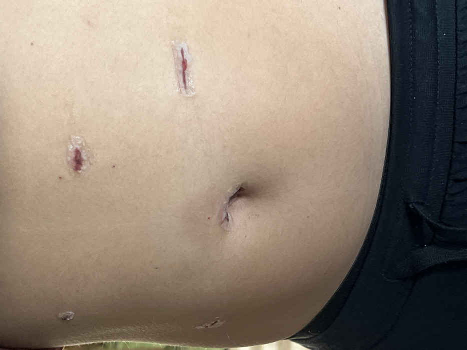 The image displays a close-up, waist-level view of a light-skinned human abdomen, located in Caen, France. The central area of the abdomen features multiple healing surgical incisions. The navel exhibits a small, healing incision with visible internal tissue. To the upper right of the navel, a laceration approximately 2 cm in length is visible beneath a clear adhesive dressing, showing dark red discoloration consistent with bruising and healing. A smaller, irregular healing lesion is present on the upper left abdomen. To the right of the navel, a linear incision approximately 2.5 cm long is covered by a clear rectangular adhesive strip, with a thin red line, possibly dried blood or suture material, visible within the wound. A partially visible, similar small healing lesion is located on the lower left flank. The lower portion of the frame shows the black waistband and fabric of casual attire, likely shorts or sweatpants. The background is uniformly out of focus and indistinct, suggesting an interior setting with ambient lighting.