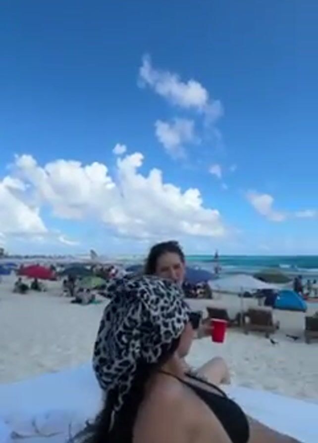 crowded beach with a clear blue sky and fluffy white clouds. There are several high-rise buildings visible in the distance. In the foreground, two women are reclining on a white lounge chair. One woman is wearing a black bikini and a printed headscarf. The other woman is seen briefly from the side and appears to be holding a red cup. There are numerous beach umbrellas, chairs, and people scattered across the white sand. The ocean waves can be seen in the background.