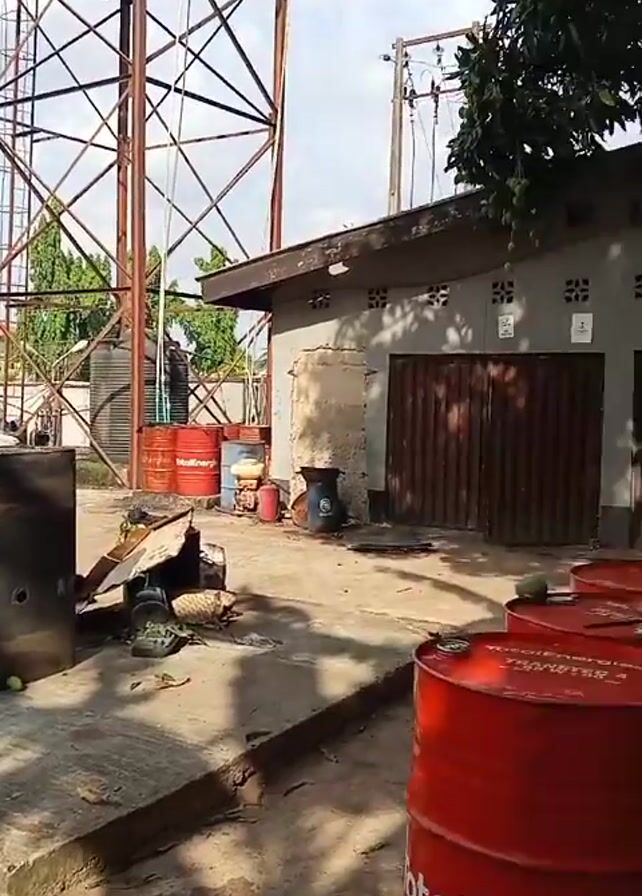 n outdoor industrial yard. A tall, rusty metal water tower stands prominently. Around the tower are red barrels, a white pickup truck, and miscellaneous equipment. A small building with rolled-up doors is visible on one side. The weather appears to be sunny with some clouds. The general impression is one of a somewhat cluttered and utilitarian industrial space. The pickup truck is parked in front of a long building.