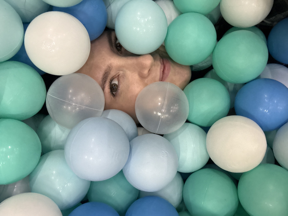 A close-up, portrait-oriented image depicts the face of an individual partially submerged within a dense aggregation of plastic balls