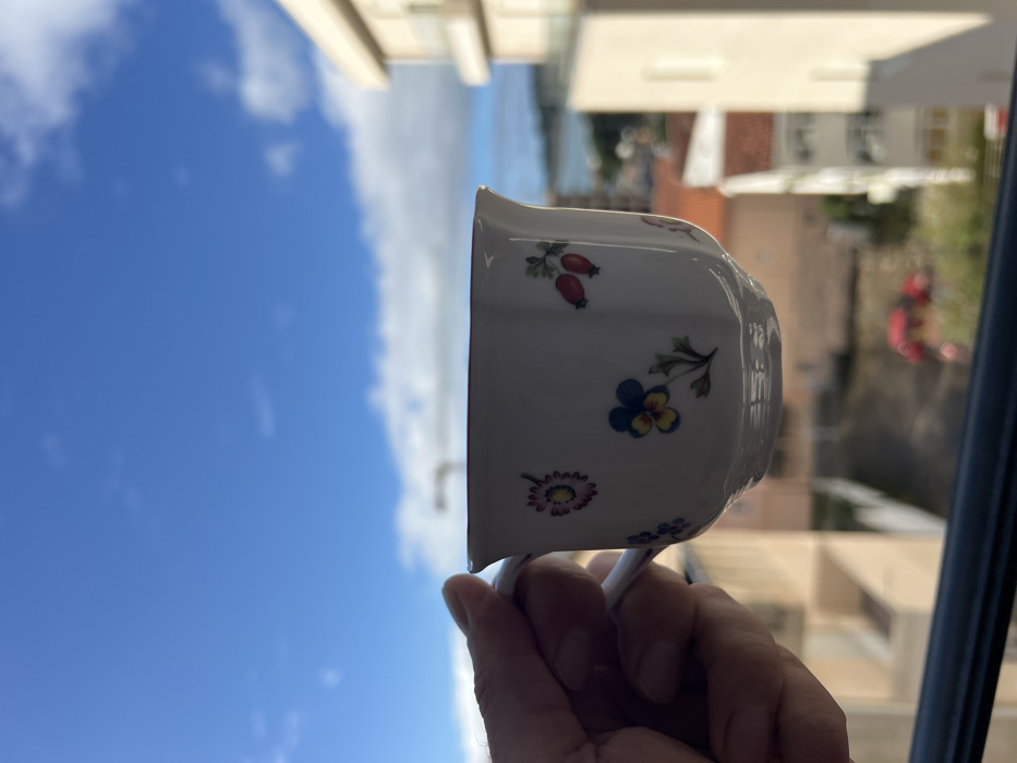 - "A light-skinned hand, likely male, holds a white porcelain cup with a fluted rim and handle in the foreground" by FM-eoZb83, licensed under CC BY 4.0