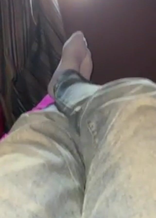 A person lies on a bed, wearing pants and socks. The scene shows a view from above their torso, with their feet towards the top of the frame. A window with striped curtains is visible in the background, letting in bright sunlight. The bed is covered with pink bedding. The room is somewhat dark, and there's a brown wall partially visible. The camera remains still.