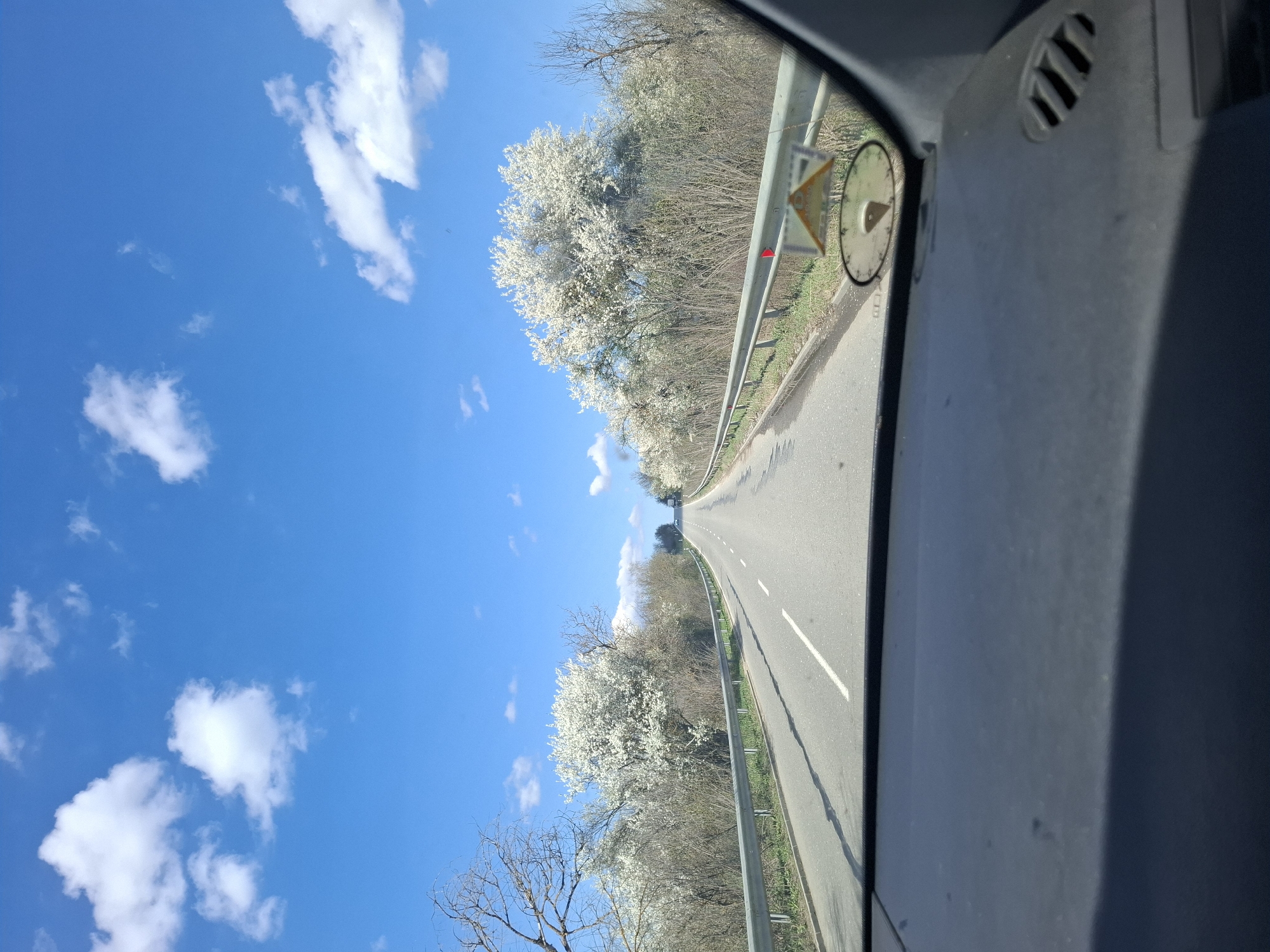 road in Smirnenski, Bulgaria, as viewed from inside a vehicle. The road stretches into the distance with a central white line marking the lanes. Guardrails run along both sides of the road. Trees with white blossoms line the road, suggesting it is springtime. A clear blue sky with scattered white clouds is visible above. The interior of the vehicle, including the dashboard and ventilation system, is also visible in the frame. A small, circular object with a triangle and numbers on it is attached to the windshield.
