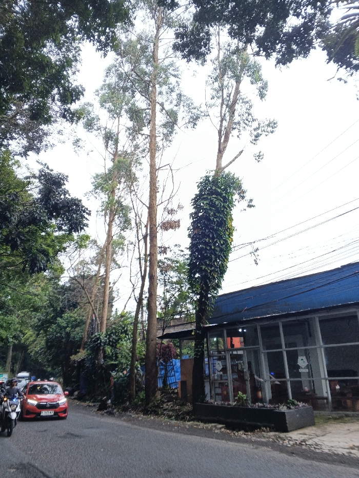 The image depicts a roadside scene in the city of Bhimad, Nepal, under an overcast sky. The foreground features an asphalt road, partially wet, with vehicular traffic. A red sedan is prominently visible on the road's left side, followed by a motorcycle with a single rider. Multiple tall, slender trees with light green foliage dominate the central and left portions of the frame. One tree trunk on the right is heavily enveloped by dense green vines. To the right, a single-story commercial building with a blue corrugated metal roof is present. Its front facade comprises large glass panels framed in dark grey, revealing an interior and a visible "STACO" sign. An elongated planter box sits directly in front of the building. Utility lines traverse the upper-right sky. Lush green foliage and undergrowth line the left side of the road and separate the trees from the building.