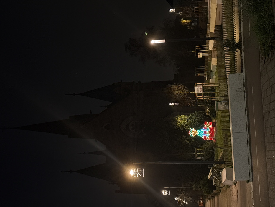 A nighttime cityscape featuring a large church silhouetted against the dark sky. Streetlights illuminate the scene, casting light on a nearby park area. A colorful Christmas display adds a festive touch. A sidewalk runs along the right edge of the frame, and bare trees and a fence are visible in the background.