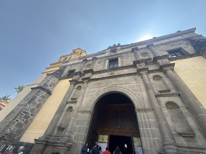 The image displays a low-angle view of the Templo de San Francisco, situated at Avenida Francisco I