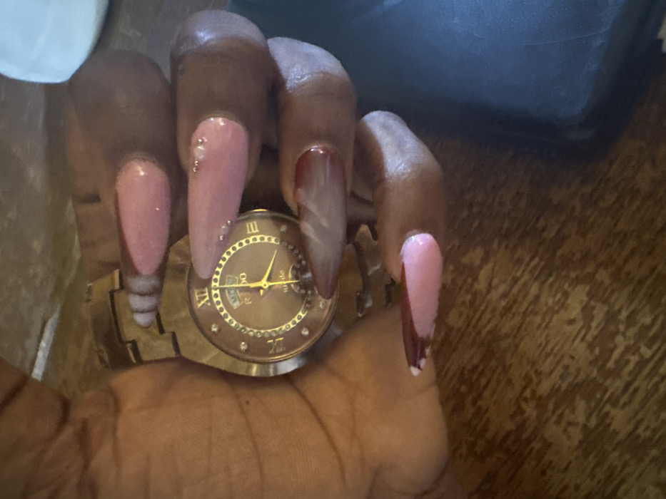 The image displays a dark-skinned hand, likely that of an adult, holding a gold-toned Rado wristwatch. The hand's fingers bear elongated, almond-shaped artificial nails. These nails are painted with a glossy, light pink base, featuring a deep maroon or reddish-brown French tip. Several nails exhibit small, clear spherical embellishments near the cuticle, while the ring finger's nail tip displays a swirled or marbled effect in maroon and translucent white. The Rado watch has a brown dial with gold-toned hands, Roman numeral XII, and clear gemstone hour markers, along with a date window. The watch's bracelet is also gold-toned. The background includes a textured brown wooden surface on the left and bottom, and blurred objects to the right, including a dark rectangular item and a white curved object. This scene takes place indoors, in the city of Jos, Nigeria.