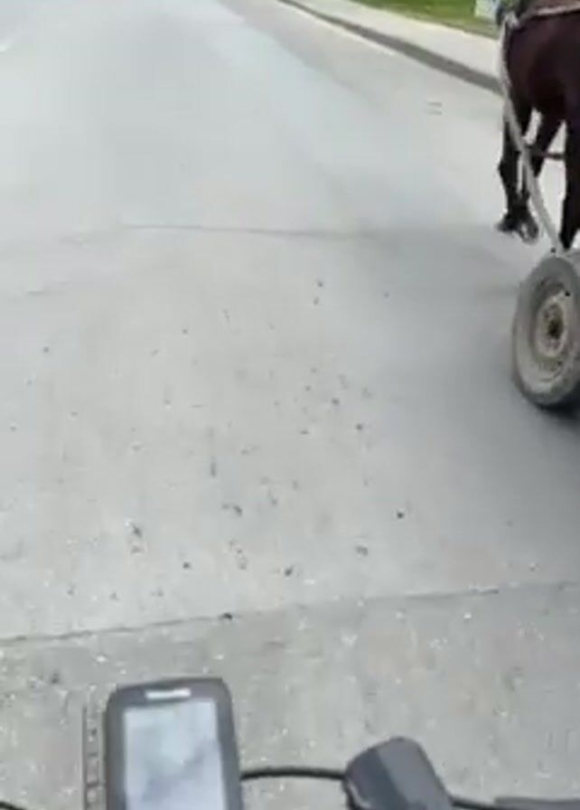 first-person perspective from someone riding a bicycle on a paved road. To the right, a horse pulls a yellow, two-wheeled cart. There are buildings and bare trees on the side of the road. A white SUV travels in the opposite direction further down the street. The bicycle has a digital display attached to the handlebars.