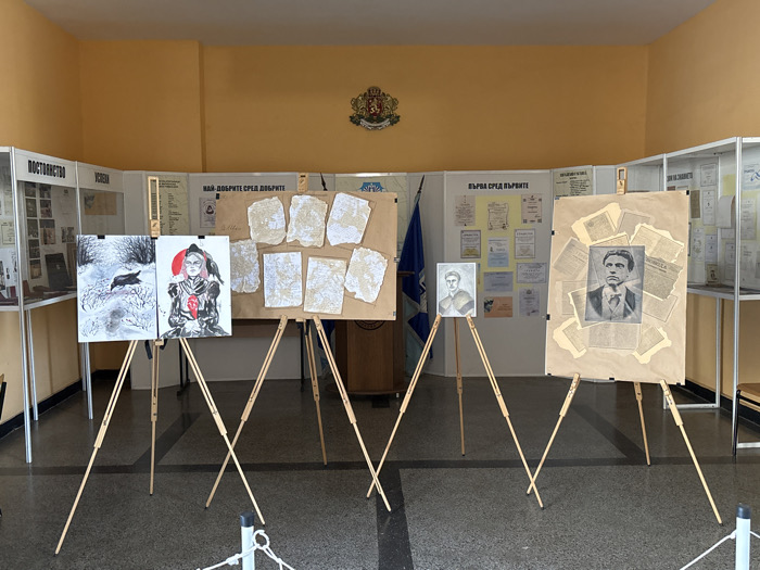 The image captures an indoor exhibition space, likely within an educational or cultural institution in Varna, Bulgaria