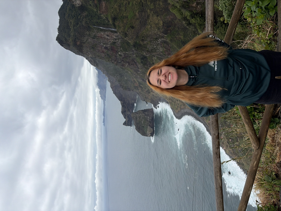 The image depicts a woman positioned at a coastal viewpoint overlooking the Atlantic Ocean and rugged cliffs in Santana, Portugal, specifically at Miradouro da Rocha do Navio