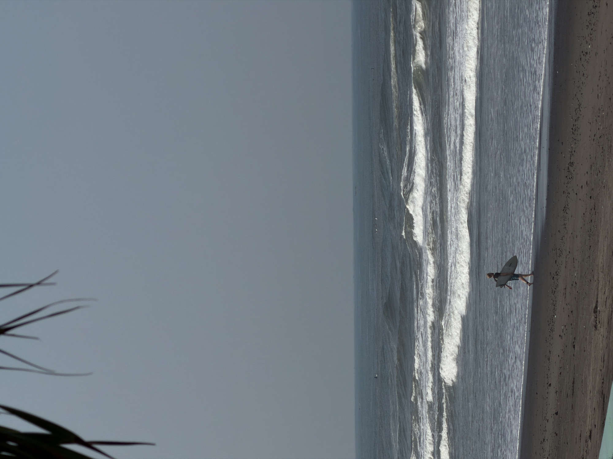 An outdoor, wide shot depicts a coastal scene in Belalang, Indonesia, under an overcast sky. The upper half of the frame is dominated by a uniform, light grey sky, partially obscured in the top left by dark, out-of-focus foliage. The lower half features a dark, likely volcanic, sand beach transitioning into a grey-blue ocean with multiple lines of white-capped waves breaking towards the shore. A single individual, appearing male, is seen walking barefoot from left to right along the water's edge on the dark sand. He is dressed in dark shorts and a dark t-shirt and carries a dark-colored surfboard under his left arm. In the mid-ground, several small, indistinct figures are visible on the ocean surface, suggesting other individuals or small watercraft. The sun is not directly visible, and the lighting is even.