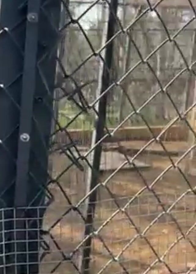 view through a chain-link fence, revealing an outdoor enclosure. The enclosure is primarily dirt and has some vegetation. There are also wooden structures. The camera moves slightly, providing a wider view of the enclosure. The scene appears to be at a zoo or wildlife park. The fence is made of dark-colored metal. The background is somewhat blurred, possibly due to the depth of field. The lighting is bright, suggesting it's daytime.