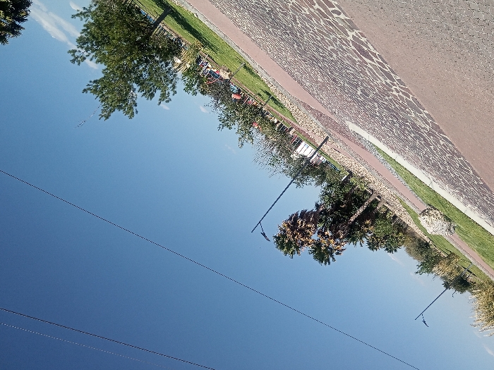 The scene depicts an outdoor urban or park environment in La Venta, Mexico, observed on a clear, sunny day from a tilted perspective. The upper third of the frame is dominated by a bright blue sky, crossed diagonally by multiple thin, dark power lines. The lower two-thirds display a paved area consisting of a reddish-brown path alongside a section of lighter, irregularly patterned paving stones. These paved surfaces are bordered by green grass strips and various vegetation, including several tall palm trees with visible trunks and fronds, and numerous deciduous trees with dense green foliage. At least two black, modern-style streetlights with visible luminaires stand along the paved paths. A large, light-colored rock or boulder is visible within a grassy area in the mid-ground. In the far background, faint structures or colorful elements are discernible beyond a stretch of water or open land. No human or animal subjects are present.