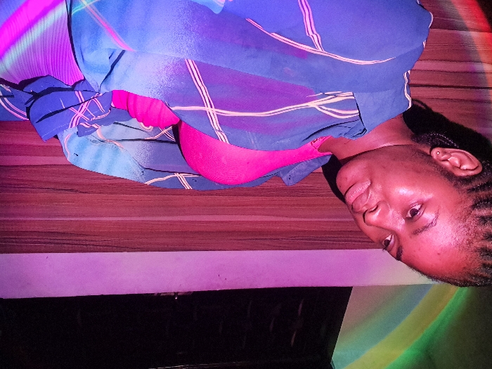 A woman with braided hair rests against a wooden backdrop with vivid color projections. She is partially draped in a blue garment with faint pink stripes, which also seems to be covering a bright pink top. Her face is turned towards the camera, lit by the colorful light, and her expression is neutral. The background transitions from wood to a white surface, illuminated by a spectrum of colors: purple, green, and yellow.