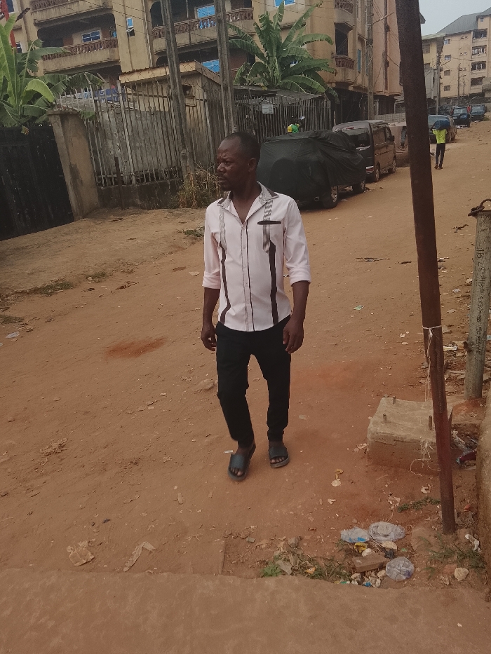 The image displays an unpaved, reddish-brown dirt road within an urban environment in Onitsha, Nigeria. A middle-aged male subject with dark skin and short dark hair is captured walking from the left to the right side of the frame, with his left foot elevated mid-stride. He is dressed in a light pink long-sleeved shirt featuring black vertical stripes and patterns on the collar and shoulders, black trousers, and dark slide sandals. His head is turned to the left, directing his gaze off-frame. In the background on the left, a multi-story building with a light-colored facade, brown balconies, and blue-tinted windows is visible behind a dark metal fence and concrete wall. Green banana plants are present near this structure. Along the dirt road extending into the distance on the right, several vehicles are parked. One vehicle in the mid-ground is covered with a black tarp. Further down the road, another individual is observed walking away, carrying a yellow object on their head or shoulder. Additional multi-story buildings line the street in the background. The immediate foreground on the right includes a rusty brown metal pole and a concrete post with visible markings. The ground is consistently reddish-brown dirt, with scattered debris, including plastic items, visible on the right side near the posts. The lighting is diffused, suggesting an overcast or hazy sky.