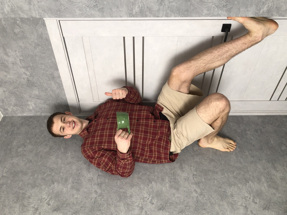A man wearing a red plaid shirt and beige shorts is lying on a gray floor. He's propped against a white cabinet door, one leg extended upward to touch the door's edge. He's holding a green mug in one hand and giving a thumbs-up with the other. He is smiling. The room's walls are light gray.