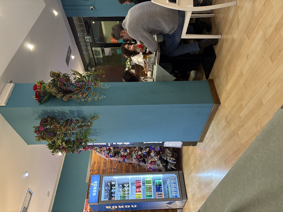 The image captures the interior of a restaurant located in Ferrara, Italy, featuring a light wooden floor and teal-colored walls. A prominent teal column, adorned with two artificial floral arrangements displaying dark green foliage and red/purple elements, occupies the midground. To the right of this column, three individuals are seated at a square table set with a light blue tablecloth. A male figure, wearing a grey knitted sweater and blue jeans, is positioned with his back mostly towards the camera, his right arm resting on the table near a glass of amber liquid. Opposite him are two females with dark hair; one, wearing a white long-sleeved top, is partially visible and appears to be looking down at the table. The other female's profile is partially obscured. Two glasses of amber liquid are visible on the table. To the left of the column, a "NORDA" branded glass-front refrigerator, stocked with bottled beers, canned soft drinks, and bottled water, stands beside a decorated Christmas tree adorned with multicolor lights and ornaments. A wooden-paneled wall section is visible behind the refrigerator and Christmas tree. In the background, beyond the dining area, a dark-framed glass door with an illuminated emergency exit sign above it can be seen.
