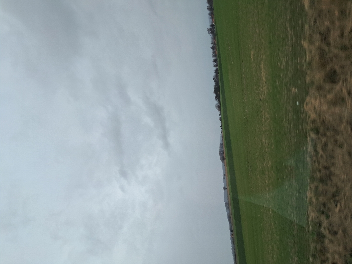 The image displays an expansive rural landscape in Ronnenberg, Germany, under a heavily overcast, grey sky that occupies the upper half of the frame. The middle ground is dominated by large agricultural fields, exhibiting varying shades of green, with a distinct lighter green band traversing horizontally across the scene. A subtle, vertical, pale streak is visible in the lower-center of the midground, consistent with a reflection on a window or lens artifact. On the distant horizon, a low ridge is present, topped by a dense line of trees, many appearing bare, interspersed with indistinct distant structures. The immediate foreground features a narrow band of dry, brown vegetation, showing slight motion blur. No individuals, animals, or discernible actions are present in the scene.