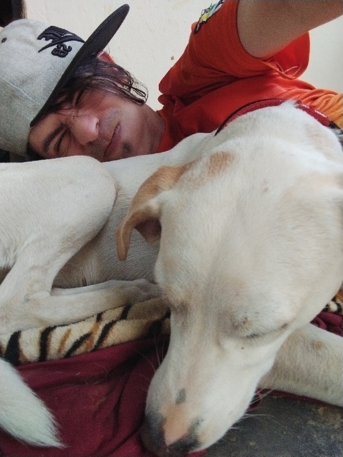 The image portrays an adult male and a dog resting indoors in the city of Tinaquillo, Venezuela
