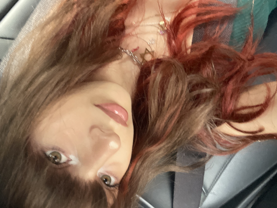 A woman's face fills the frame, tilted slightly. She has brown hair with red highlights, styled with bangs that partially obscure her eyes. Her eyes are light brown, framed by white eyeshadow. Her lips are glossy and pink. She wears a silver necklace with pendants, including a Star of David. The background shows a car interior with a dark gray seat and a green garment visible in the upper right corner.